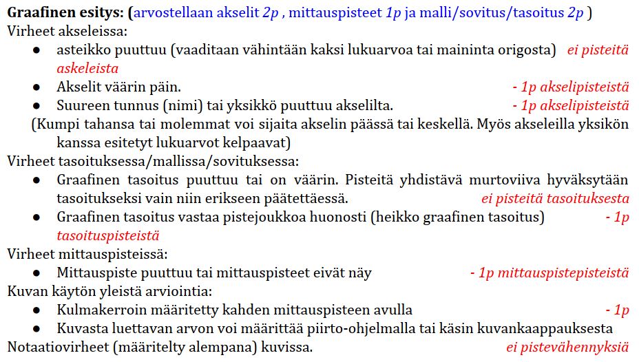 Kuvaaja tuotetaan kokelaan valitsemalla koejärjestelmän ohjelmalla, ja se liitetään kuvakaappauksena osaksi vastausta. Kuvaajan akseleilla on esitettävä suure,  yksikkö ja asteikko.